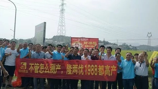 上午9時(shí)許,一行50多人從酒店出發(fā)前往北盛鎮(zhèn)隆兩優(yōu)1988觀摩會現(xiàn)場,田間立著財(cái)神稻的展示噴繪,財(cái)神客戶們紛紛駐足拍照留影,有的還下到田里看穗子、數(shù)分蘗,仔細(xì)查看品種表現(xiàn)。觀摩田塊為5月18日播種,瀏陽區(qū)域大部分農(nóng)戶都是選擇一晚種植,集中在5月中下旬播種,剛好遭遇了高溫高濕的天氣,隆兩優(yōu)1988在今年特殊年份所表現(xiàn)出的超高結(jié)實(shí)率、稻瘟病抗性、分蘗能力得到在場所有人的一致好評。