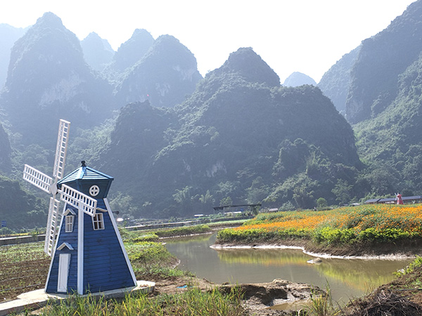 環(huán)山繞水,碧水藍天下金色的稻穗在風中搖曳,在陽光中閃爍著別樣的美麗,這里是百色田東縣步兵鎮(zhèn)模范村,新農村大改造的生態(tài)度假村。