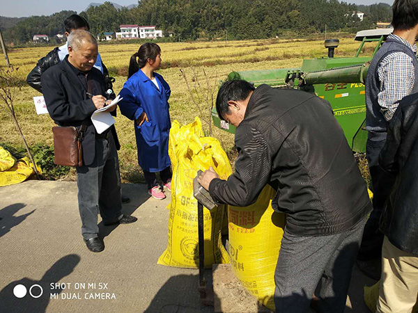 種植大戶段應征在大家的圍觀下開動了收割機,一陣忙碌之后,在大家的見證下谷子裝袋過稱,1.5畝地,實收濕谷950.4斤,折合干谷538斤/畝,根據(jù)種植大戶段老板介紹,今年頭季下田是4月1日,頭季收割是在8月22號,產(chǎn)量在1300-1500斤之間,相對再生稻種植偏遲一個禮拜左右,對錯過季節(jié)還能有這個產(chǎn)量也是相當滿意,在場的專家及大戶對深兩優(yōu)5814的再生稻種植表現(xiàn)非??隙?,明年計劃在3月25日左右下田,頭季收割在8月15日之前,掌握好相關技術,深兩優(yōu)5814的再生稻產(chǎn)量可以達到600-800斤!