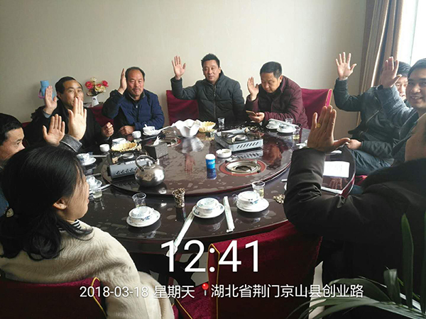 2018年3月18日,和風(fēng)細(xì)雨,萬物復(fù)蘇,而水稻銷售也即將迎來高峰期。這一天中午,京山代理商曹總帶領(lǐng)京山石龍和雁門口的經(jīng)銷商、鐘祥代理商杜總帶領(lǐng)五三和長灘的經(jīng)銷商、以及亞華種業(yè)荊門區(qū)域經(jīng)理晏經(jīng)理等人相聚五三,參加隆兩優(yōu)華占首屆鐘京市場協(xié)調(diào)會(huì),本次共有13人參加會(huì)議。