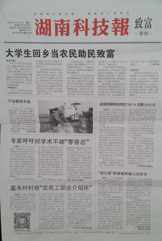 據(jù)了解,2014年,鄧東勝種植水稻5000畝,2010年被評為“全國勞動模范”稱號、2012年當選湖南省人大代表。據(jù)鄧東勝介紹,以前全部種的是常規(guī)稻,2012年開始觀察深兩優(yōu)5814,通過觀察發(fā)現(xiàn),深兩優(yōu)5814抗倒、高產(chǎn)穩(wěn)產(chǎn)、好管理,比較適合大戶種植。2014年試種360畝,實收后平均得干谷671公斤∕畝,高產(chǎn)田達到800公斤∕畝,低的也有550公斤∕畝。