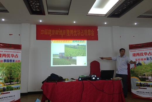安徽分公司總經(jīng)理武俊海給零售商做品種介紹,通過例舉在不同的氣候條件、不同的栽培模式下品種的表現(xiàn)情況,總結(jié)了隆兩優(yōu)華占的八大亮點(diǎn):1、株葉形態(tài)好;2、分蘗力強(qiáng);3、耐肥、抗倒;4、高抗稻瘟??;5、耐高溫抗低溫;6、適合各種栽培模式;7、秧齡彈性大;8、主穗、分蘗穗整齊大小一致。