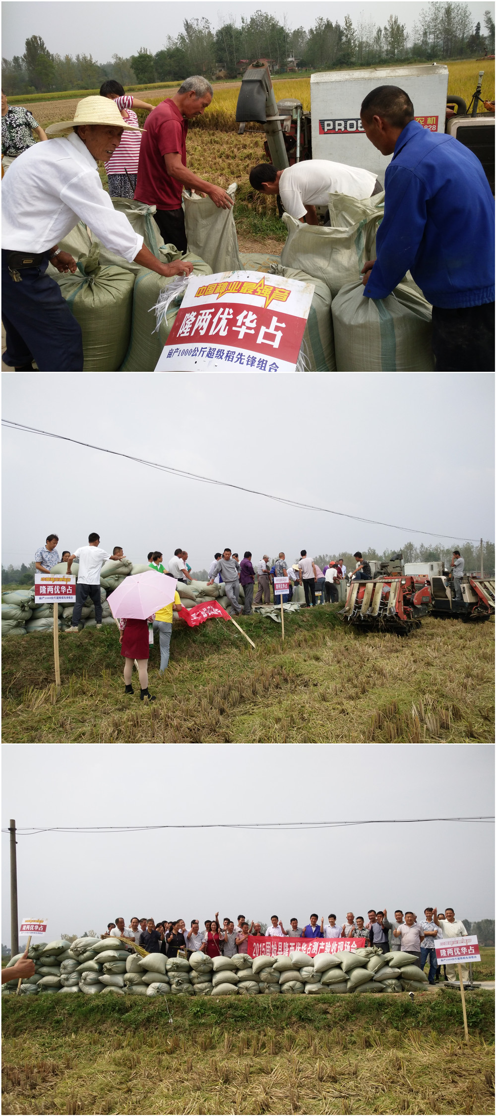 2015年9月19日,40位零售商齊赴郭陸灘鎮(zhèn)圈堰村致富農(nóng)場,他們需要在田間考察隆兩優(yōu)華占的種植表現(xiàn),見證現(xiàn)場收割的產(chǎn)量。該田由種田大戶——周志富(15037686538) 4月12日播種,面積30畝,按照大戶栽培模式管理。經(jīng)過了8月27日的龍卷風肆虐,已過了成熟期,依然笑立田間,展示著豐收的風采。