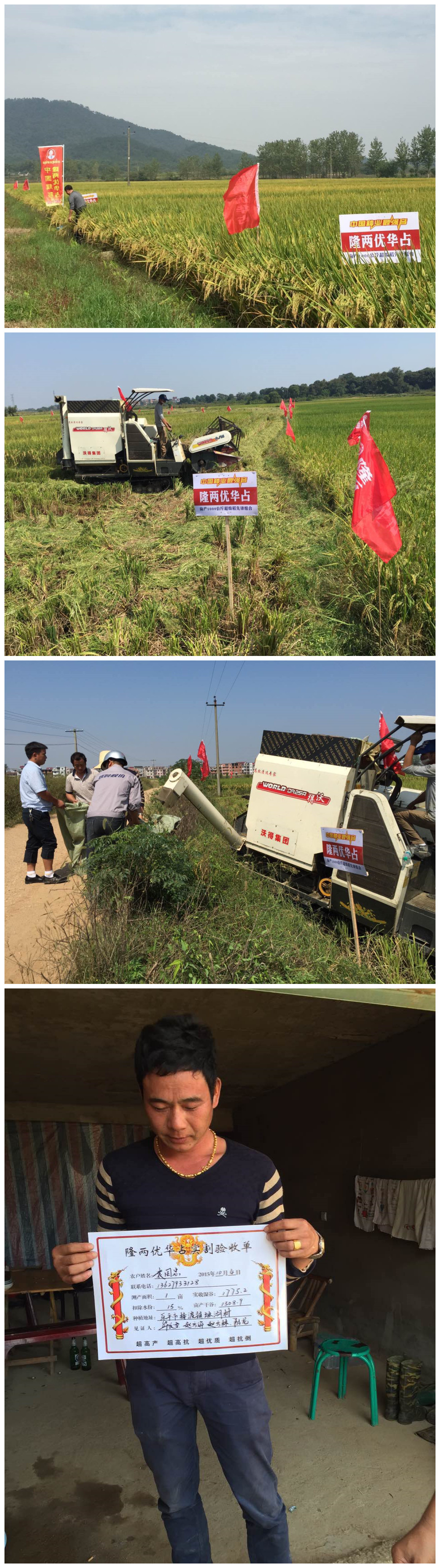 2015年10月4日,在公司測(cè)產(chǎn)小組成員陳龍、代理商華長(zhǎng)雪及種田大戶(hù)趙方林、趙方海的見(jiàn)證下,對(duì)袁國(guó)忠(13627933128)種植的隆兩優(yōu)華占一季晚稻進(jìn)行現(xiàn)場(chǎng)收割,測(cè)產(chǎn)結(jié)果:平均畝產(chǎn)1775.2斤(濕谷)。種田大戶(hù)袁國(guó)忠表示:“這個(gè)產(chǎn)量,我很滿(mǎn)意,因?yàn)檫@塊田施肥及管理一般,不過(guò)我種的隆兩優(yōu)華占二晚肯定是要比一晚產(chǎn)量還要高”!
