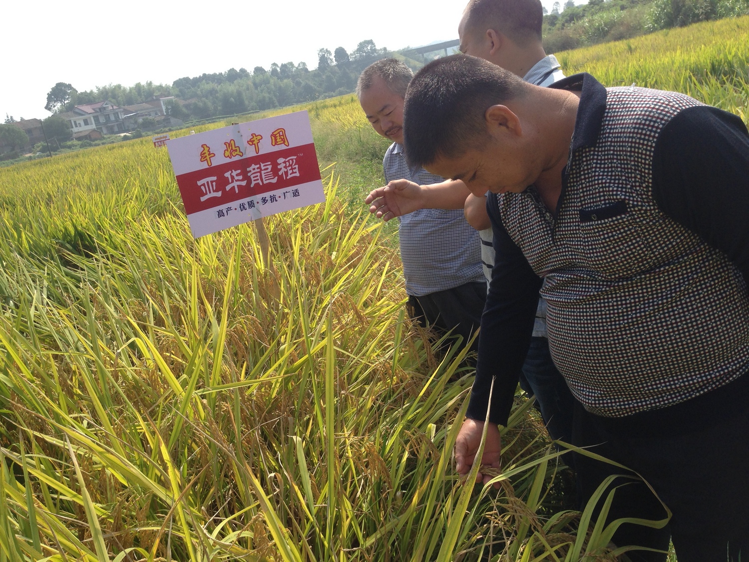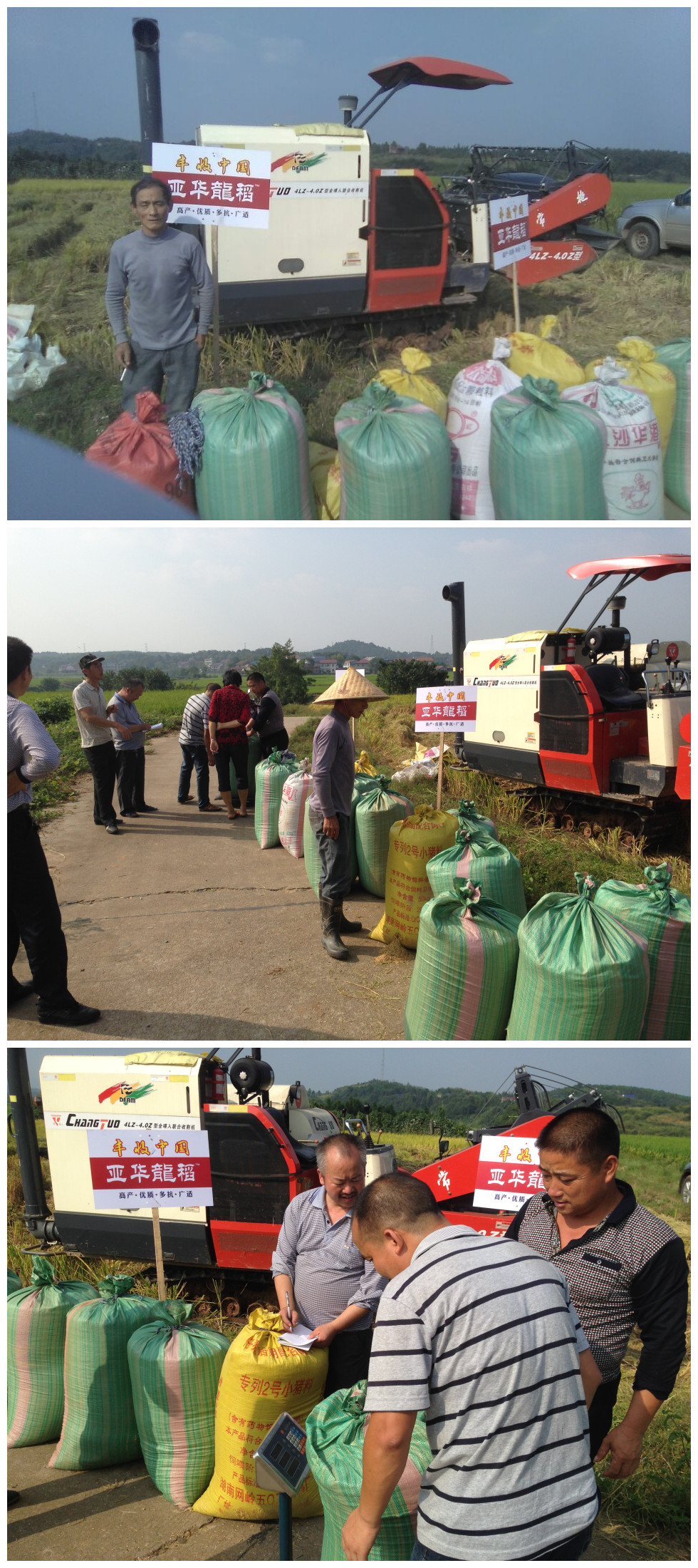 2015年 9月28日天高氣爽,來自攸縣各鄉(xiāng)鎮(zhèn)的經(jīng)銷商和大戶來到網(wǎng)嶺鎮(zhèn)參加由攸縣經(jīng)銷商援偉農(nóng)資公司組織的亞華龍稻現(xiàn)場測產(chǎn)會(huì)。在大家的共同見證下,測產(chǎn)田塊0.7畝,整丘現(xiàn)場收割機(jī)收割,現(xiàn)場過稱得濕谷709.8公斤,折合畝產(chǎn)濕谷2028斤。種植戶劉老板介紹:“他今年種植3畝亞華龍稻的中稻,作為一個(gè)種植新手(以前做家具生意,現(xiàn)在50多歲回來種田),輕松種出這樣的產(chǎn)量,太讓人驚喜了。我已經(jīng)在黃豐橋鎮(zhèn)承包了100畝土地,明年要多種亞華龍稻”。測產(chǎn)后劉老板又帶著大家觀看了連片種植的10多畝亞華龍稻的晚稻田,該品種晚稻種植安全、齊穗、抗性好,預(yù)計(jì)產(chǎn)量在1300斤左右。
