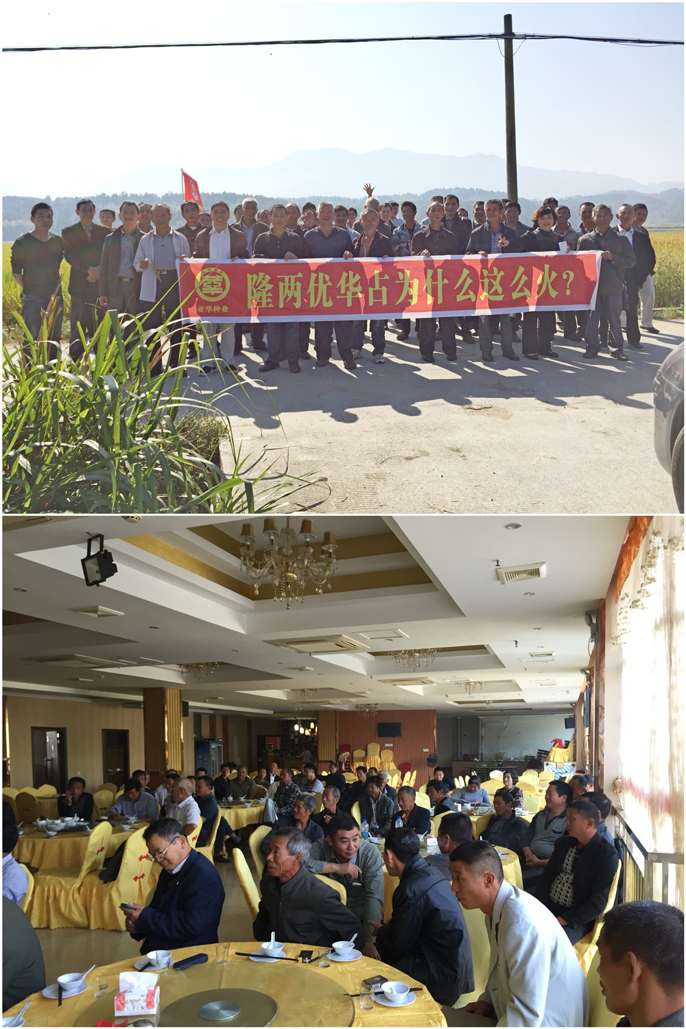 剛下車,大家不約而同地念起田里的橫幅“隆兩優(yōu)華占為什么這么火”,抱著這個疑問紛紛下田看禾。經(jīng)銷商們?nèi)齼山Y(jié)伙地品評著。