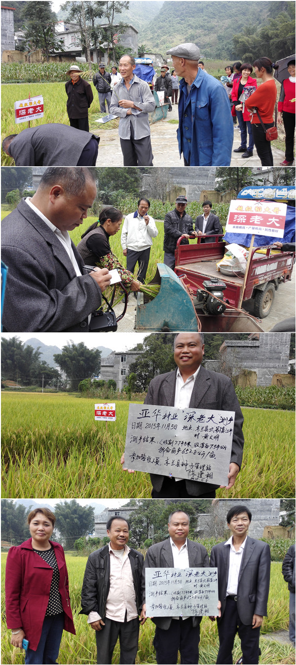 引進(jìn)新的水稻好品種,讓老區(qū)人民種出穩(wěn)產(chǎn)、高產(chǎn)田,在主糧上實(shí)現(xiàn)豐收,助推加快脫貧致富的步伐,一直是東蘭縣種子管理部門以及縣、鄉(xiāng)兩級經(jīng)銷商的共同心愿。作為東蘭縣農(nóng)業(yè)局原種子管理站站長,也是東蘭縣高級農(nóng)藝師的韋聯(lián)康,把篩選適宜當(dāng)?shù)氐暮闷贩N作為自己最大的職責(zé)。通過2年的觀察后,韋站長將亞華種業(yè)的“深老大”品種鄭重地推薦給了經(jīng)銷商陳麗云。2015年,本著謹(jǐn)慎的態(tài)度,陳麗云引進(jìn)了少量的“深老大”種子在全縣多個(gè)鄉(xiāng)鎮(zhèn)試種,全面考察該品種的表現(xiàn)。切學(xué)、隘洞、長江等中稻區(qū)的表現(xiàn)非常優(yōu)異,抗病又抗倒,8月份已喜獲豐收??h種子管理站在切學(xué)、隘洞兩鄉(xiāng)鎮(zhèn)組織的品種對比驗(yàn)產(chǎn)中,“深老大”畝產(chǎn)高達(dá)700多公斤,在多個(gè)品種中高居第一!