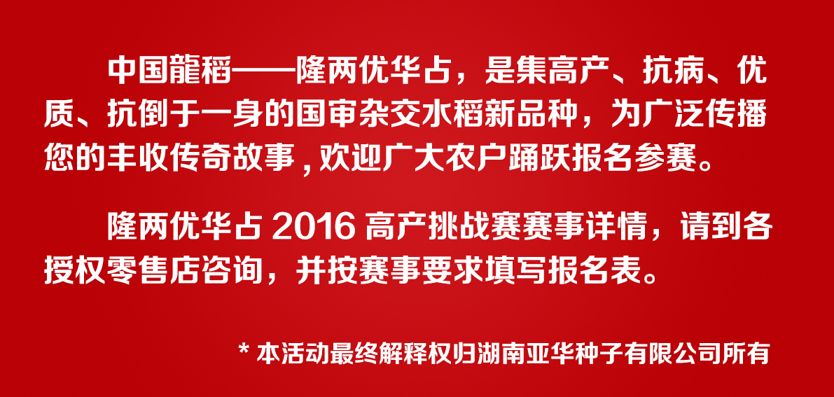 隆兩優(yōu)華占2016高產(chǎn)挑戰(zhàn)賽報名開始啦!