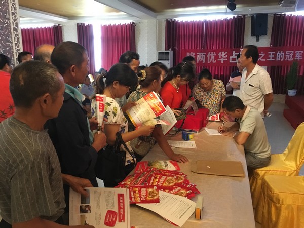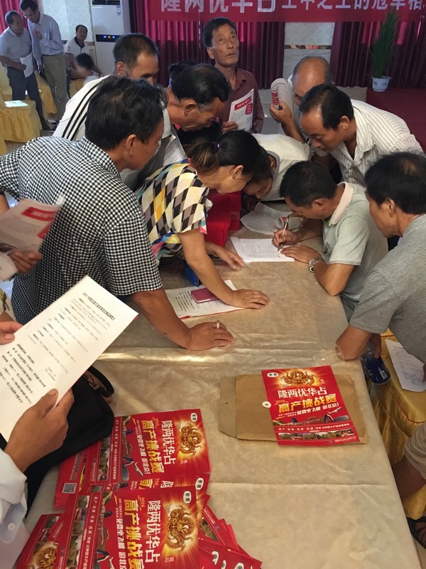 本次會議由當(dāng)代零售商王經(jīng)理主持。會議上,首先由代理商、農(nóng)藝師龍飛向在座農(nóng)民朋友講解了隆兩優(yōu)華占“超抗病、超高產(chǎn)、超抗倒、超優(yōu)質(zhì)”的四大優(yōu)勢,并且播放PPT與大家分享了隆兩優(yōu)華占在全國各地的優(yōu)秀表現(xiàn)與審定情況,同時現(xiàn)場展示了隆兩優(yōu)華占植株抽穗后的良好長勢。 接下來,由姜總向大家講解了今年隆兩優(yōu)華占的預(yù)定政策與優(yōu)惠政策,并表達(dá)了自己的美好希冀。然后,主持人王經(jīng)理又著重強(qiáng)調(diào)了隆兩優(yōu)華占的四大優(yōu)勢特點(diǎn),并組織了有獎問答,農(nóng)民熱情高漲,踴躍參與。借著高漲的氛圍,預(yù)訂的場面隨之拉開了帷幕。