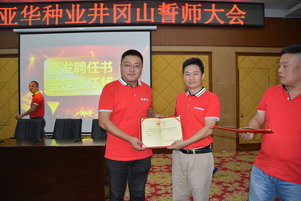 在此次誓師大會上各事業(yè)部簽定了2017-2018年度的責(zé)任狀、給個事業(yè)部優(yōu)秀個人頒發(fā)聘書及獎勵,總經(jīng)理孫衛(wèi)華給各事業(yè)部授旗及發(fā)表重要講話。會上孫總總結(jié)了上一個業(yè)務(wù)年度亞華集團的成績與不足,對國際種業(yè)行業(yè)的發(fā)展趨勢進行了剖析,以及對下一年度“大亞華•新發(fā)展”的計劃目標(biāo)。