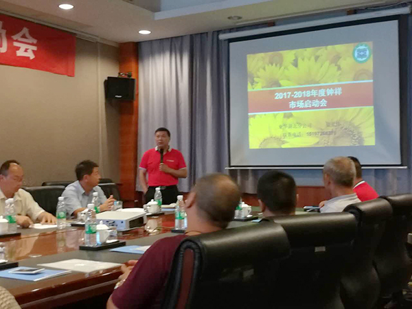 會議開始由姜總發(fā)表講話,姜總分別就亞華種業(yè)的品種優(yōu)勢、資金實力、科研營銷團隊以及種子加工、質量嚴格把控等各方面給與會人員做了介紹,并和大家分享了“選擇大于努力”的財富成功故事,為2018隆兩優(yōu)華占繼續(xù)強勢挺進鼓氣。最后姜總詳細講解了公司在鐘祥市場的宣傳計劃,各種獎懲措施以及資金人力投入等,為2018隆兩優(yōu)華占再戰(zhàn)輝煌作好準備。
