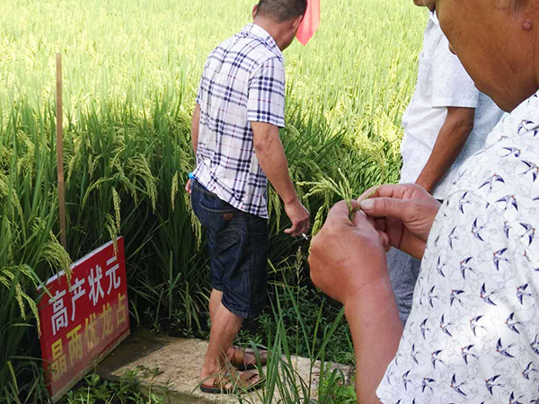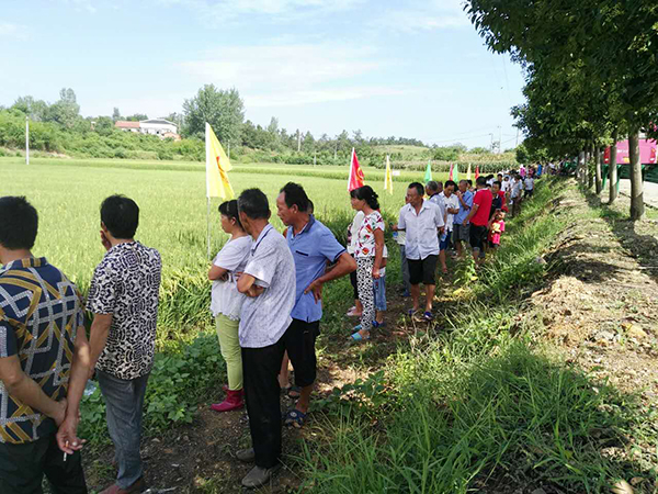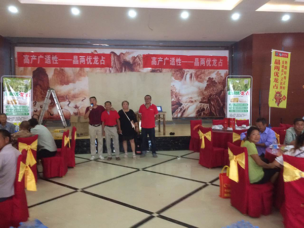 2017年8月9日、12日和13日分別在棗陽王城鎮(zhèn)、熊集鎮(zhèn)和吳店鎮(zhèn)召開了三場晶兩優(yōu)龍占的田間觀摩會和訂購會,在代理商陳福剛的組織下,共有700多名農(nóng)戶參與了會議。