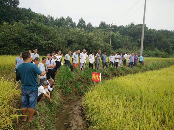 2017年8月27日,來自王家橋鎮(zhèn)的30余名農(nóng)戶來到關(guān)洲村8組的田間進(jìn)行隆兩優(yōu)華占現(xiàn)場觀摩。其中,有不少農(nóng)戶是具有多年種植經(jīng)驗的老農(nóng),品種好不好,他們有自己的種植經(jīng)驗,看分蘗、看空癟粒、看株葉形態(tài),就能了解得差不多。甚至有農(nóng)戶直接脫下鞋,赤腳踩進(jìn)田中,隨機選取幾蔸,數(shù)有效穗,又隨機取幾穗,拿到田埂上仔細(xì)地數(shù)了數(shù)總粒數(shù)及空憋粒,然后豎起大拇指,興奮地說到:“這個品種分蘗力強,結(jié)實率高,明年就種它了!”