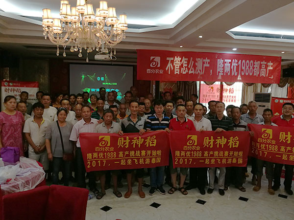 測產(chǎn)會后,在洪山鎮(zhèn)零售商胡老板的主持下召開室內(nèi)會議,會議首先由百分農(nóng)業(yè)湖南財神線經(jīng)理陳鋒就百分農(nóng)業(yè)概況、財神稻在全國各區(qū)域的表現(xiàn)、高產(chǎn)賽等情況給在場的觀摩人員進行了介紹與講解。之后與會的零售商和種植大戶就財神稻的種植要點以及田間管理要求進行了交流。會場十分火爆,有種植大戶之前對品種選擇十分猶豫,70多畝田選了好幾個品種種植進行對比,財神稻高抗病、耐高溫、高抗倒的表現(xiàn)在田間表現(xiàn)得淋漓盡致,所以種植大戶說明年只種財神稻。