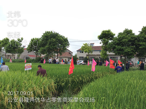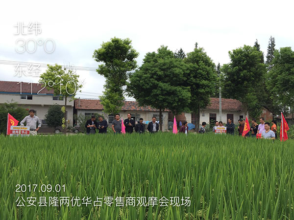 2017年9月1日上午,來自公安縣各鄉(xiāng)鎮(zhèn)的零售商及種植大戶20余人在代理商余總的帶領(lǐng)下,來到位于夾竹園鎮(zhèn)紅星村隆兩優(yōu)華占的田間進(jìn)行現(xiàn)場觀摩。