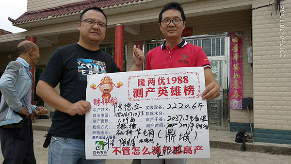 2017年8月30日上午,在應(yīng)鼎城石公橋經(jīng)銷(xiāo)商陳月清的組織下召開(kāi)隆兩優(yōu)1988的測(cè)產(chǎn)會(huì),參會(huì)人員有常德鼎城代理商陳總、袁總、百分農(nóng)業(yè)湖南大區(qū)劉浩經(jīng)理、鼎城區(qū)高級(jí)農(nóng)藝師周老師和陳老師及28位零售商、種植大戶和農(nóng)戶。