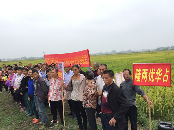 2017年9月5日,來自紙廠河鎮(zhèn)的60余名農戶在當?shù)芈蓛?yōu)華占零售商肖建平經理的組織下,來到位于大湖村5組黃文平的田間,參加隆兩優(yōu)華占的現(xiàn)場實收會。