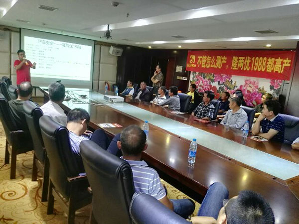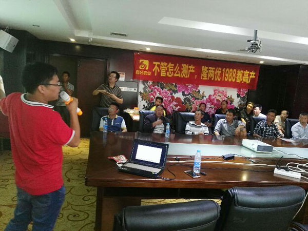 下午4點,各位財神來到的桂緣酒店的會議室,由百分張經(jīng)理組織大家簽到入座。會議隨著主持人鐘總的簡單介紹,拉開了帷幕,張經(jīng)理通過PPT介紹公司,詳細(xì)講解隆兩優(yōu)1988的特征特性,接著百分魏總做總結(jié),并就公司安全、產(chǎn)品安全、種子質(zhì)量安全、渠道安全等安全問題進行詳細(xì)地講解。會后到來的財神直說,隆兩優(yōu)1988品種好不說,公司也非常好,解決了買種后的后顧之憂。