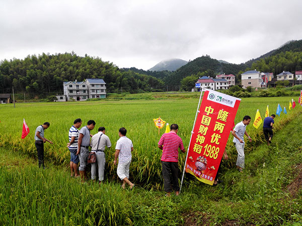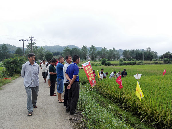 上午九點(diǎn)多,七輛車載著近七十位鄉(xiāng)鎮(zhèn)經(jīng)銷商和種植大戶來到財(cái)神稻示范田觀摩,示范田的財(cái)神稻近六分熟,但其有效穗、穗粒數(shù)、結(jié)實(shí)率和株葉形態(tài)表現(xiàn)分外搶眼,田中間每株有效穗十四根以上,穗粒231粒,秕谷7粒,尤其是結(jié)實(shí)率高達(dá)百分之九十以上,觀摩人員紛紛對(duì)其點(diǎn)贊。經(jīng)銷商對(duì)財(cái)神稻表示熱切關(guān)注,種植大戶躍躍欲試,表示明年一定要種上一種。