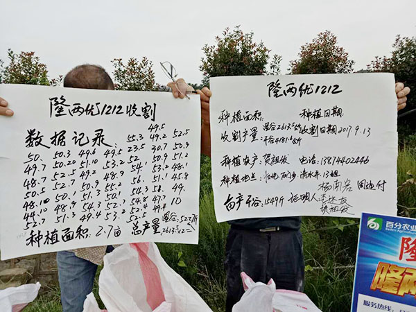 田的面積不大,但收割的產(chǎn)量卻并不少,2.7畝田,收獲了52袋谷子5227斤,折算每畝收獲1936斤濕谷,扣除20%的水分,干谷產(chǎn)量高達(dá)1549斤/畝田。當(dāng)問及種植戶賀祖發(fā)對隆王稻——隆兩優(yōu)1212這個(gè)品種是否滿意時(shí),他回答到:“種隆王稻,我不后悔”。
